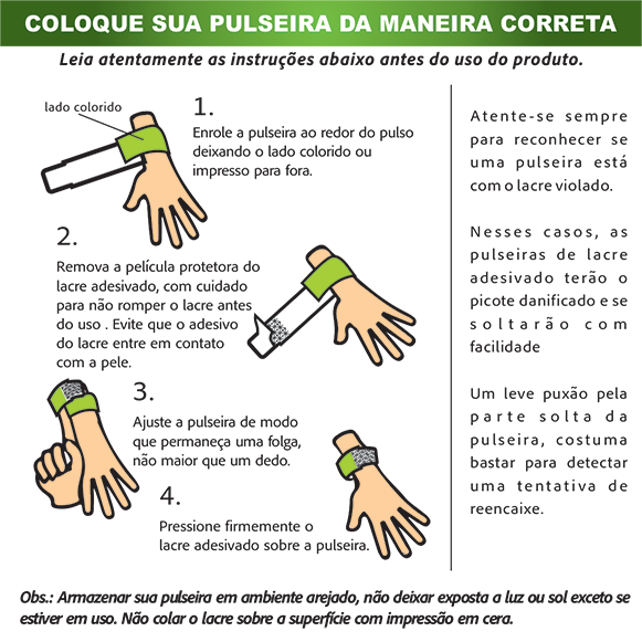 >> Eventos em geral; uso hospitalar para controle de acesso e triagem; parques aquáticos e hotéis, festivais, concertos, etc.>> Ideais para a identificação de situações rápidas e fáceis.>> O lacre adesivo é inviolável, com cortes de segurança que se trituram na tentativa de adulterar a pulseira, assim seu uso é único e intransferível.